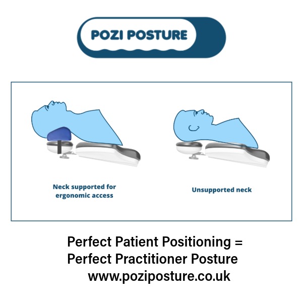 The Pozi Posture Standard Memory Foam Headrest moulds to the patients neck, relieving pressure on the back of the head and supporting the neck, giving comfort and support. In turn it positions the patient better for ergonomic access, preventing musculoskeletal issues from occurring for the dentist, therapist or hygienist. Ergonomic Memory Foam Dental Chair Headrest covered in anti-microbial wipe cleanable fabric, with elastic strap to attach to the chair. The fabric has an impregnated anti-microbial layer, which actually kills harmful microbes, including COVID. This means that when patients lie on it, any microbes are instantly killed and cannot be transferred to anyone else. Read more here.